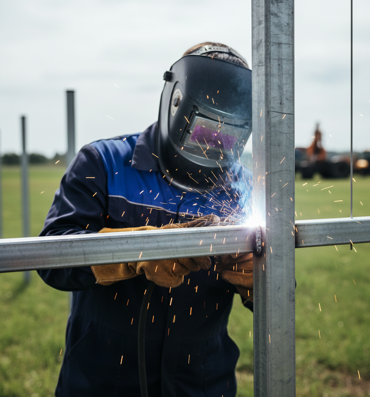 Метал: Труба профільна 40х20 просто приварюється до металевого стовпа. Зварювальний шов — це моноліт. Це найміцніший тип з'єднання, який існує. Робота зварювальника займає хвилини, а міцність — на віки.