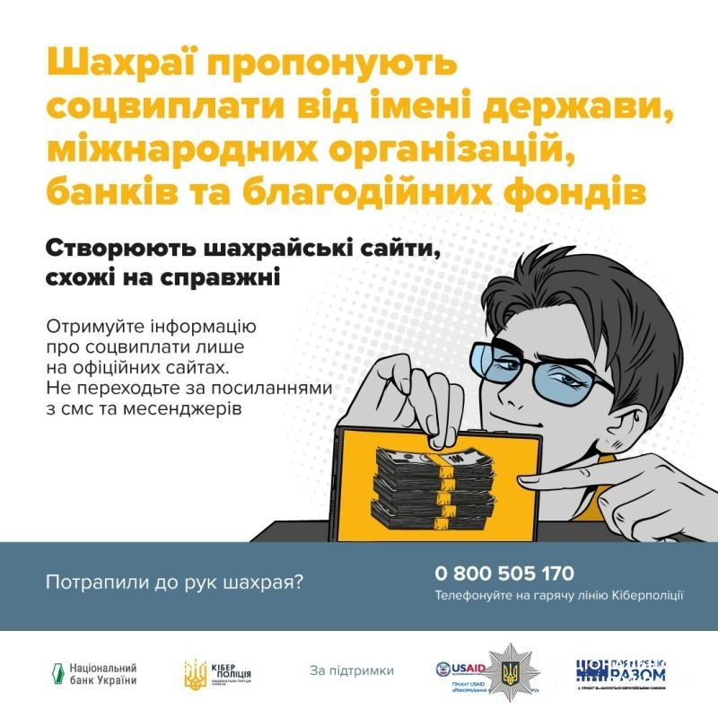 Правоохоронці застерігають: реклама в соціальних мережах або повідомлення в месенджерах із пропозицією отримати грошову допомогу від держави або благодійних організацій – це поширена схема шахраїв, створена для виманювання персональних даних та реквізитів банківських карток.