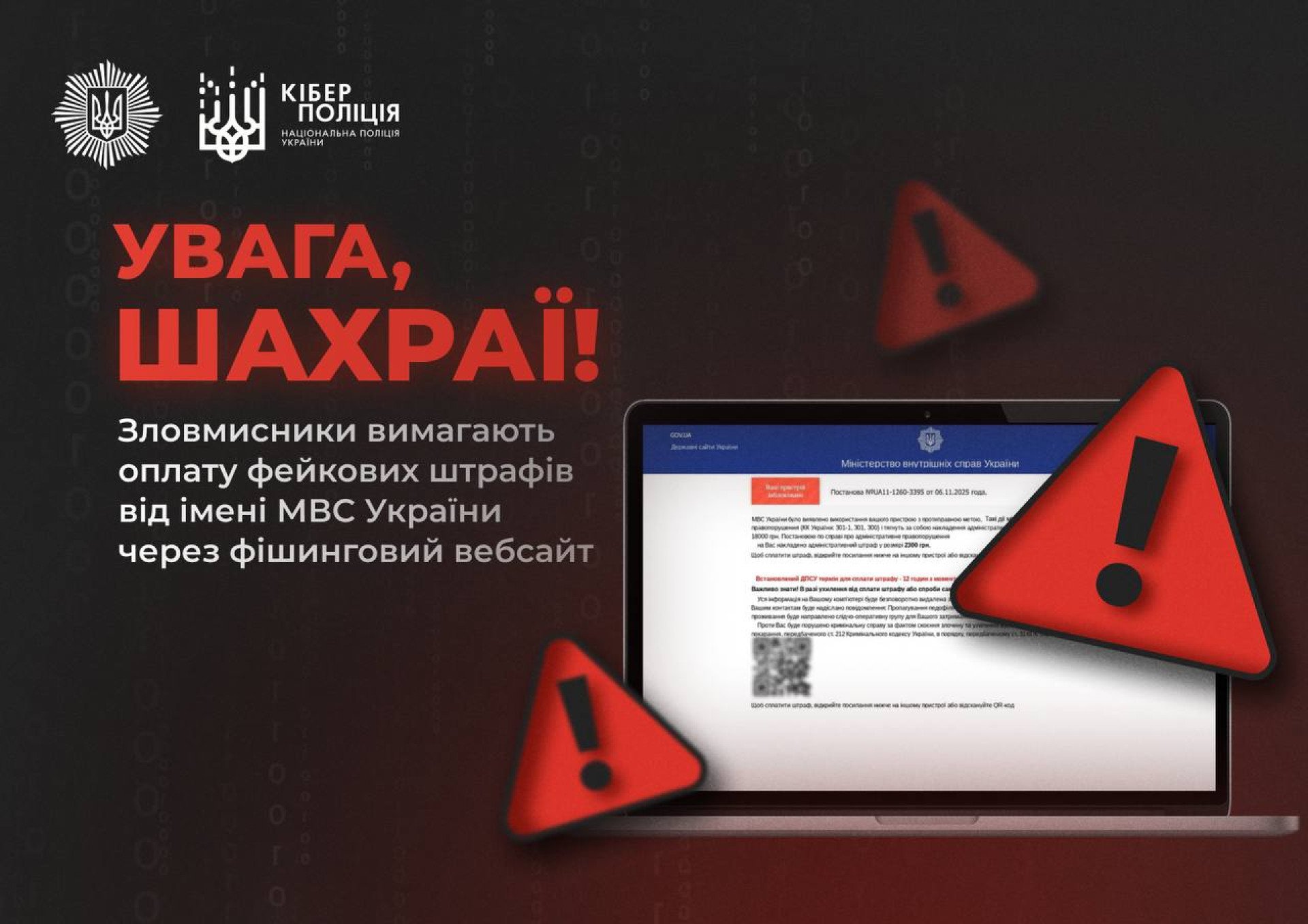 - У тексті описується нібито порушення з боку користувача і вимагається оплатити штраф нібито від імені МВС України.