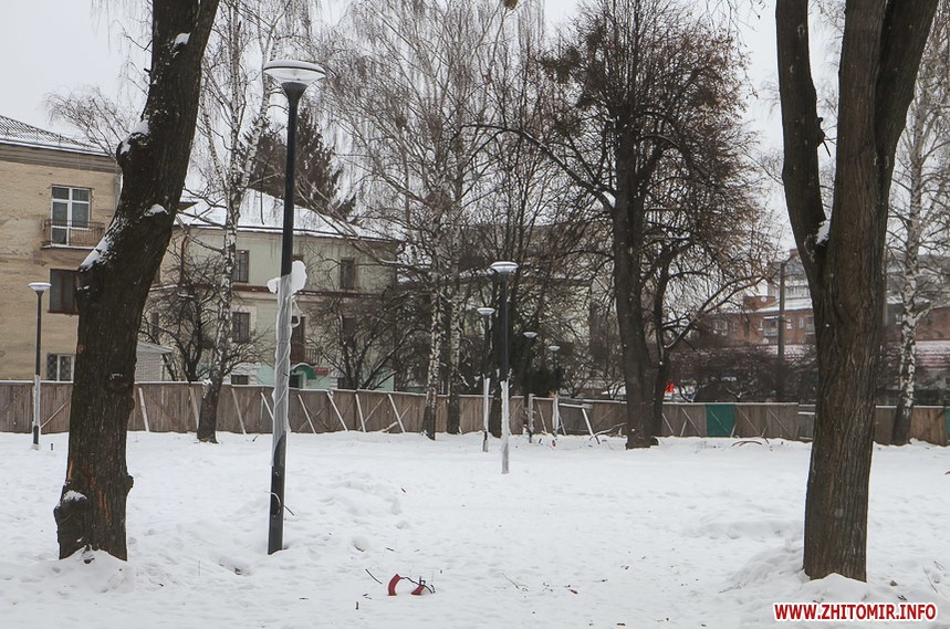 14 січня на місці майбутнього скверу порожньо. Ділянка за парканом вкрита снігом. На ній - одинока велопарковка, розрита траншея, з-під землі стирчать трубки з електрокабелем для підсвітки. Паркан несуцільний, тож у майбутньому сквері можна побачити рідких перехожих. І, що найприкріше, городяни вже почали зносити під паркан сміття: у кількох місцях лежать пакети з непотребом.