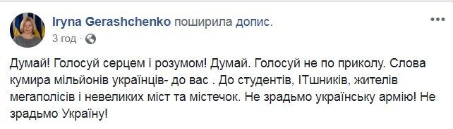 "Будь ласка, якщо вам важливо майбутнє нашої країни, прийдіть і проголосуйте, за кого хочете. Але вибори — це не прикол, голосуйте не по приколу", — поділився Хливнюк.