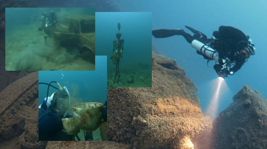 Дайвер показав унікальні експонати, які виглядали вражаюче й створювали справжню містичну атмосферу. Там можна побачити мотоцикл з коляскою, автівки, гармату на колесах, автомат. Серед усього є навіть скелет з вантажем, який коментатори називають "Валєрою".