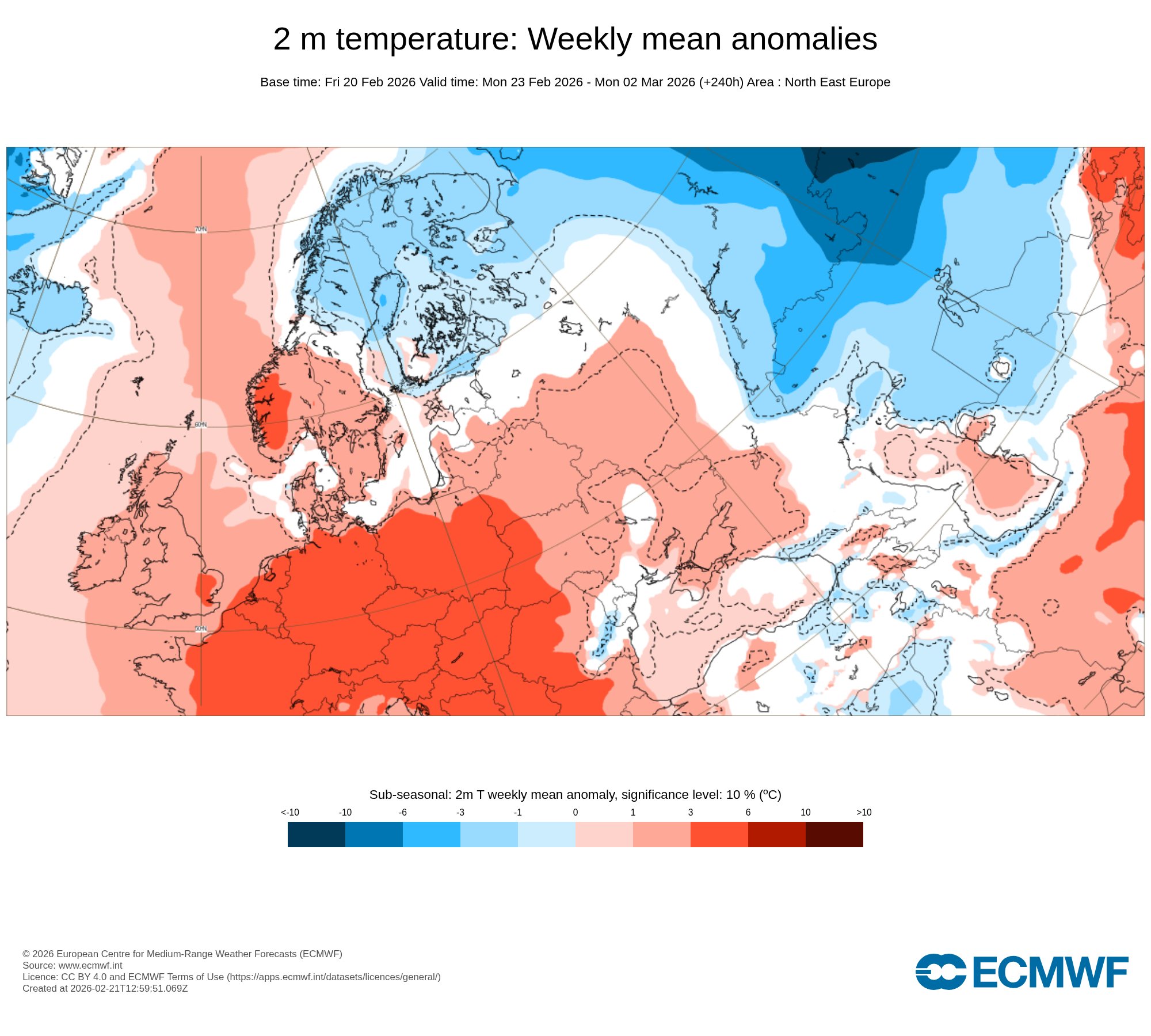 Прогноз середньої аномалії температури повітря у Європі на період з 23 лютого по 1 березня 2026 (дані ECMWF):