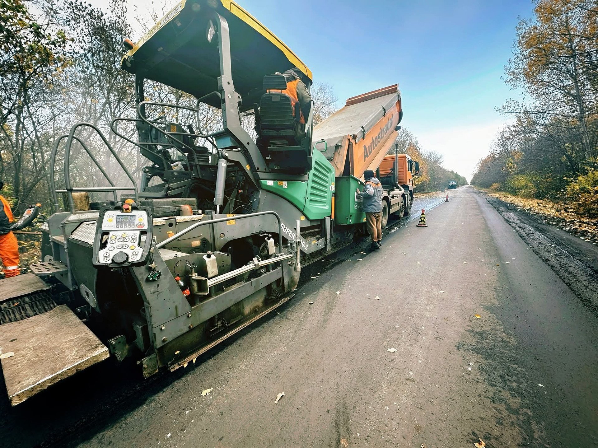 Наразі фахівці працюють на ділянці автошляху в Любарській територіальній громаді. Тут, для ліквідації множинних пошкоджень дорожнього покриття, проводять холодне фрезерування, обробку ділянки бітумною емульсією та влаштовують вирівнюючий шар асфальтоукладальником.