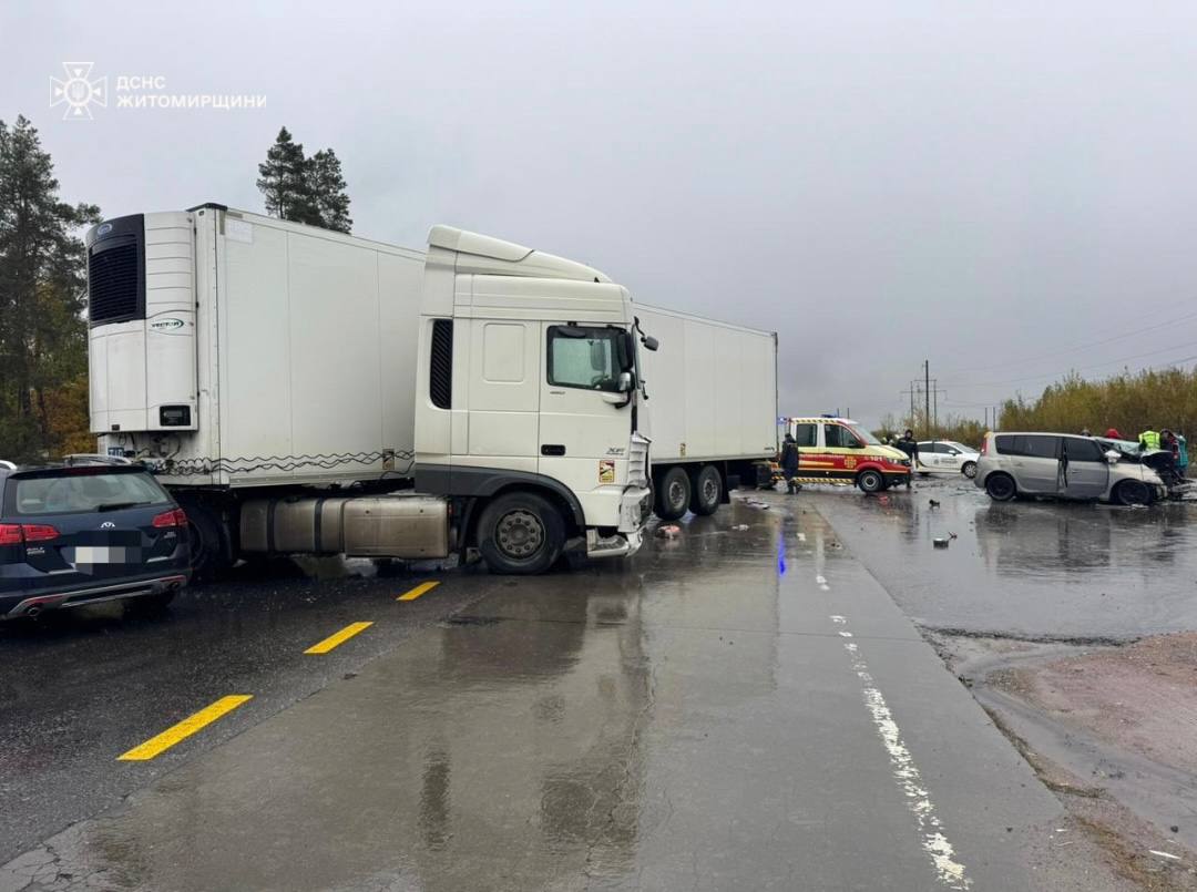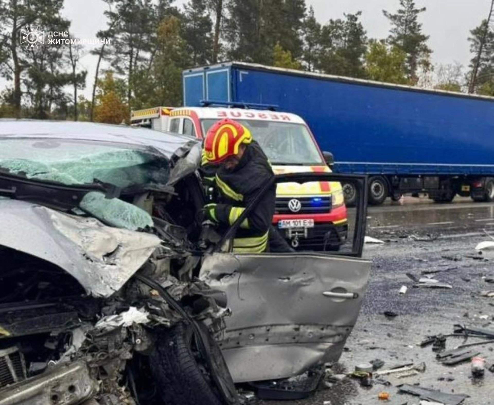 Внаслідок ДТП за участю вантажівки та чотирьох легкових автомобілів у селі Сонячне, водія одного із легковиків затисло всередині.