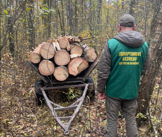 «Під час одного з планових виїздів виявлено дві зрубані сосни, діаметром 63 та 44 сантиметри. Поряд, на відстані 30 метрів, стояв гужовий причіп, завантажений деревиною тієї ж породи. За попередніми підрахунками, обсяг деревини становить приблизно до трьох кубометрів», — йдеться у повідомленні.