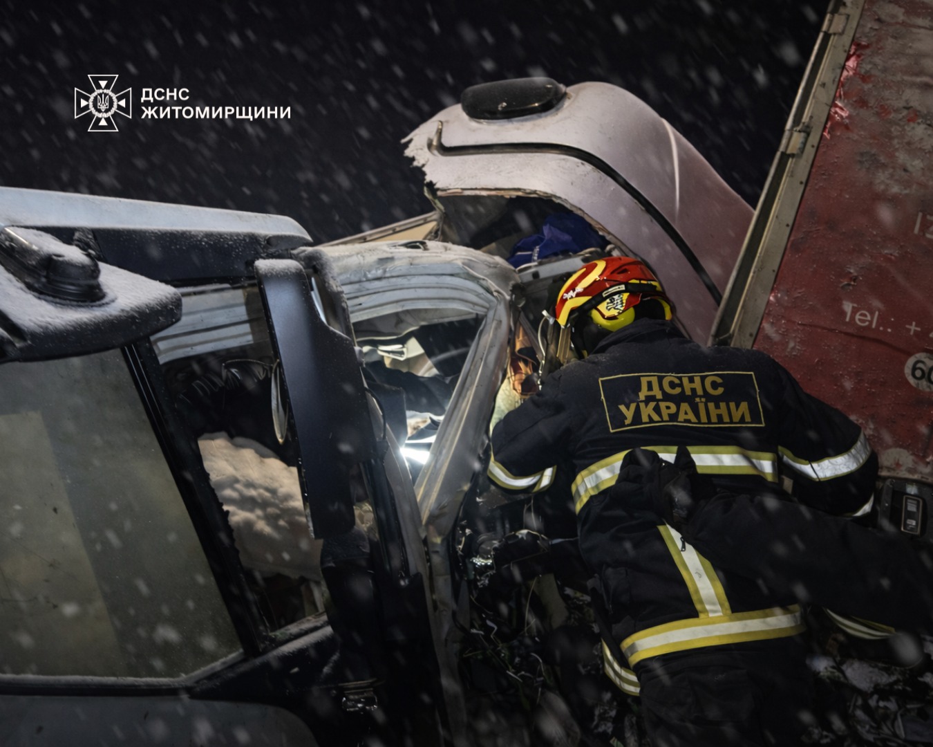 ДТП на Житомирщині: рятувальники деблокували постраждалого водія та відбуксирували пошкоджені авто.
