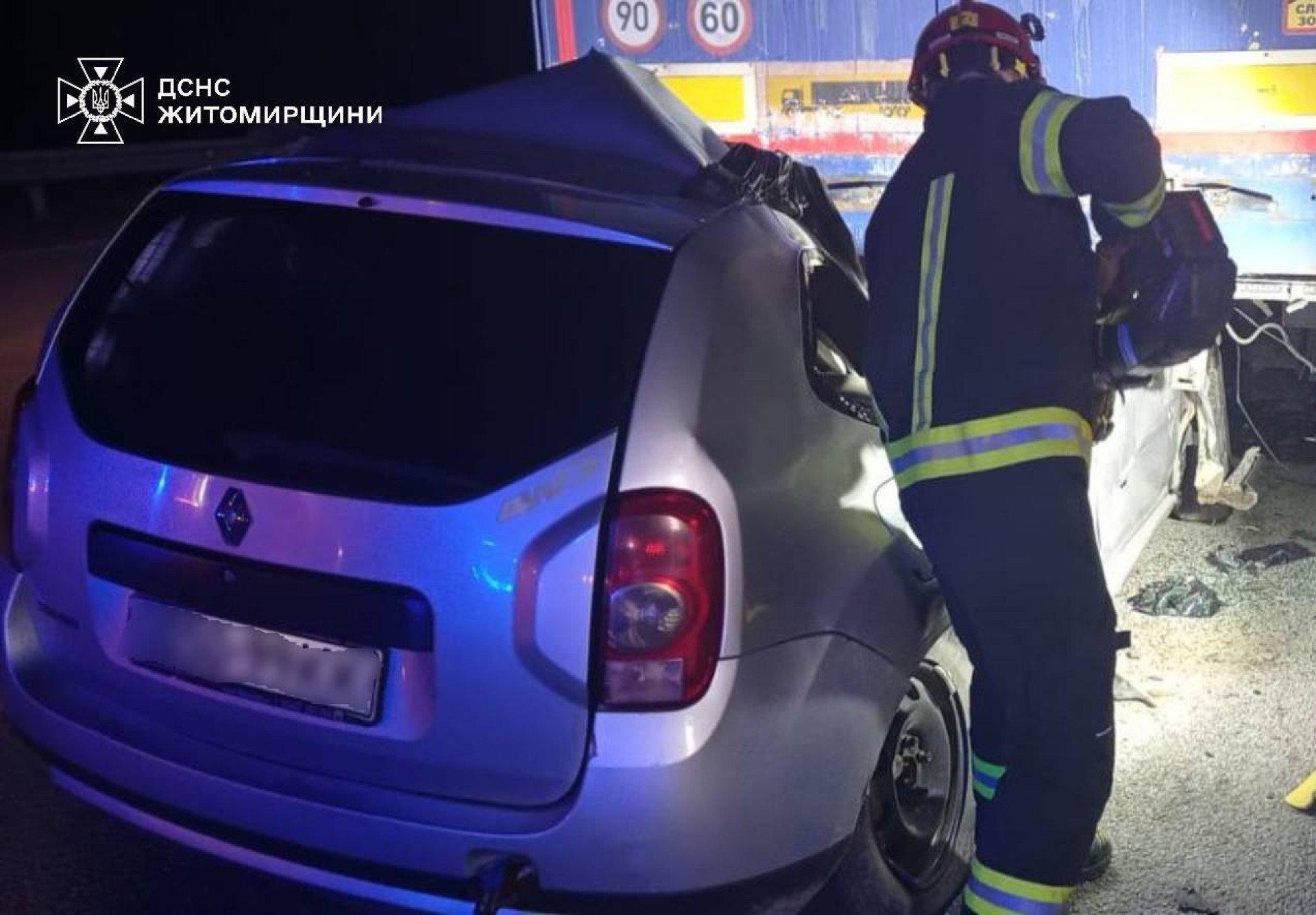 За попередньою інформацією водій автомобіля Renault Daster, рухаючись у напрямку м. Звягеля, виїхав на узбіччя, де сталося зіткнення з нерухомою вантажівкою MAN", - йдеться в повідомленні.