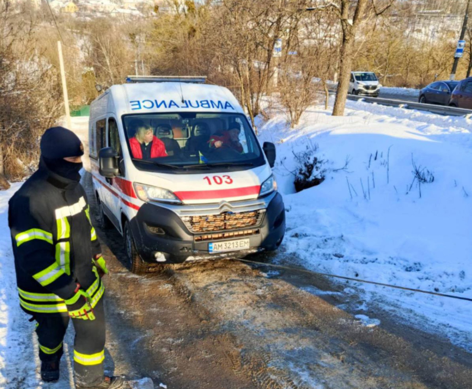 "Учора у Житомирі фахівці ДСНС надали допомогу працівникам екстреної медичної допомоги, які прямували з хворою людиною та через ожеледицю не могли заїхати на крутий підйом. За допомогою троса та пожежного автомобіля рятувальники відбуксирували «швидку» на безпечну ділянку дороги, після чого вона вже продовжила рух самостійно.
