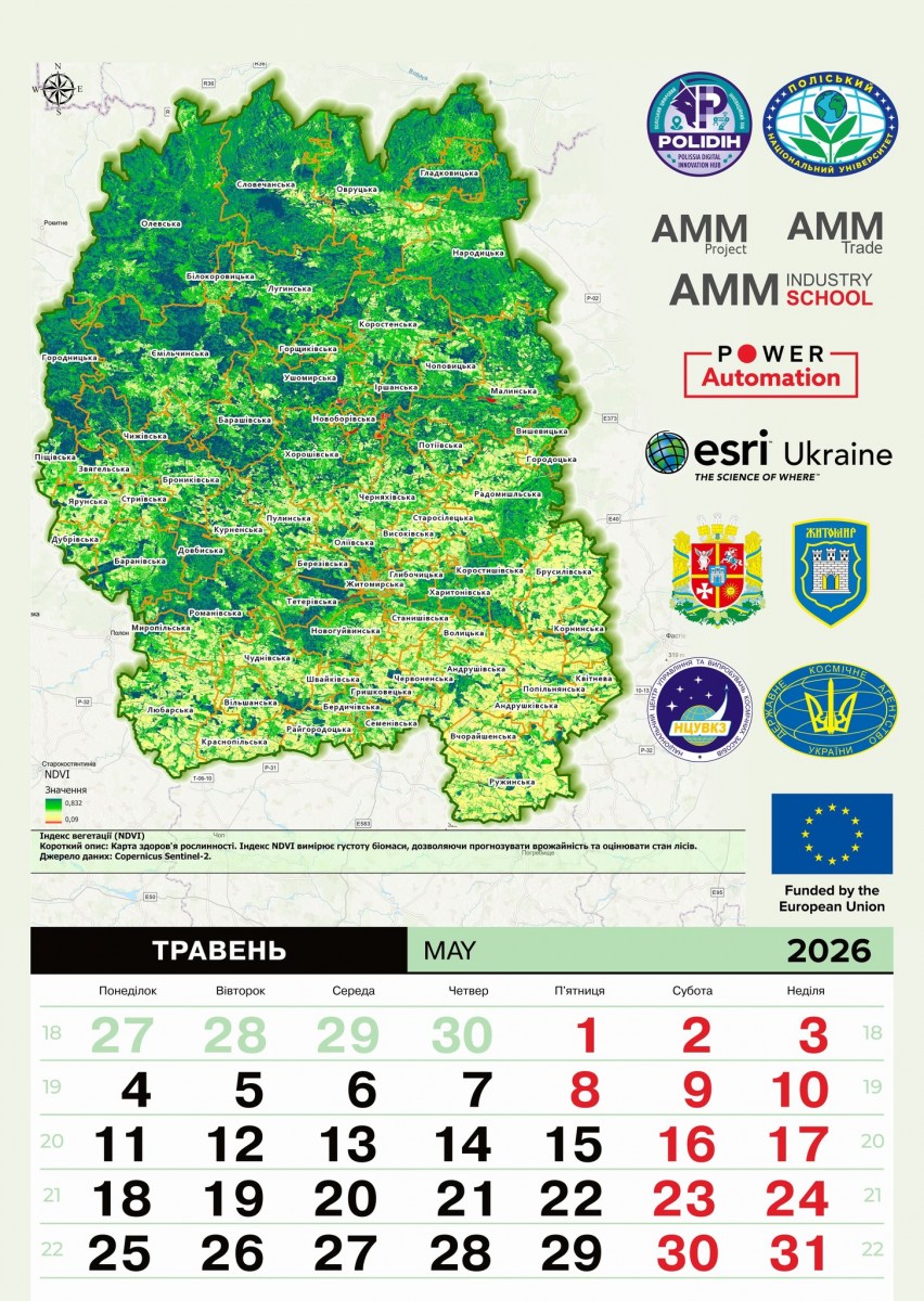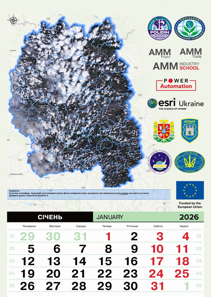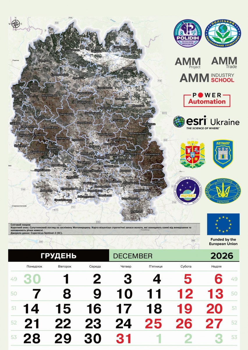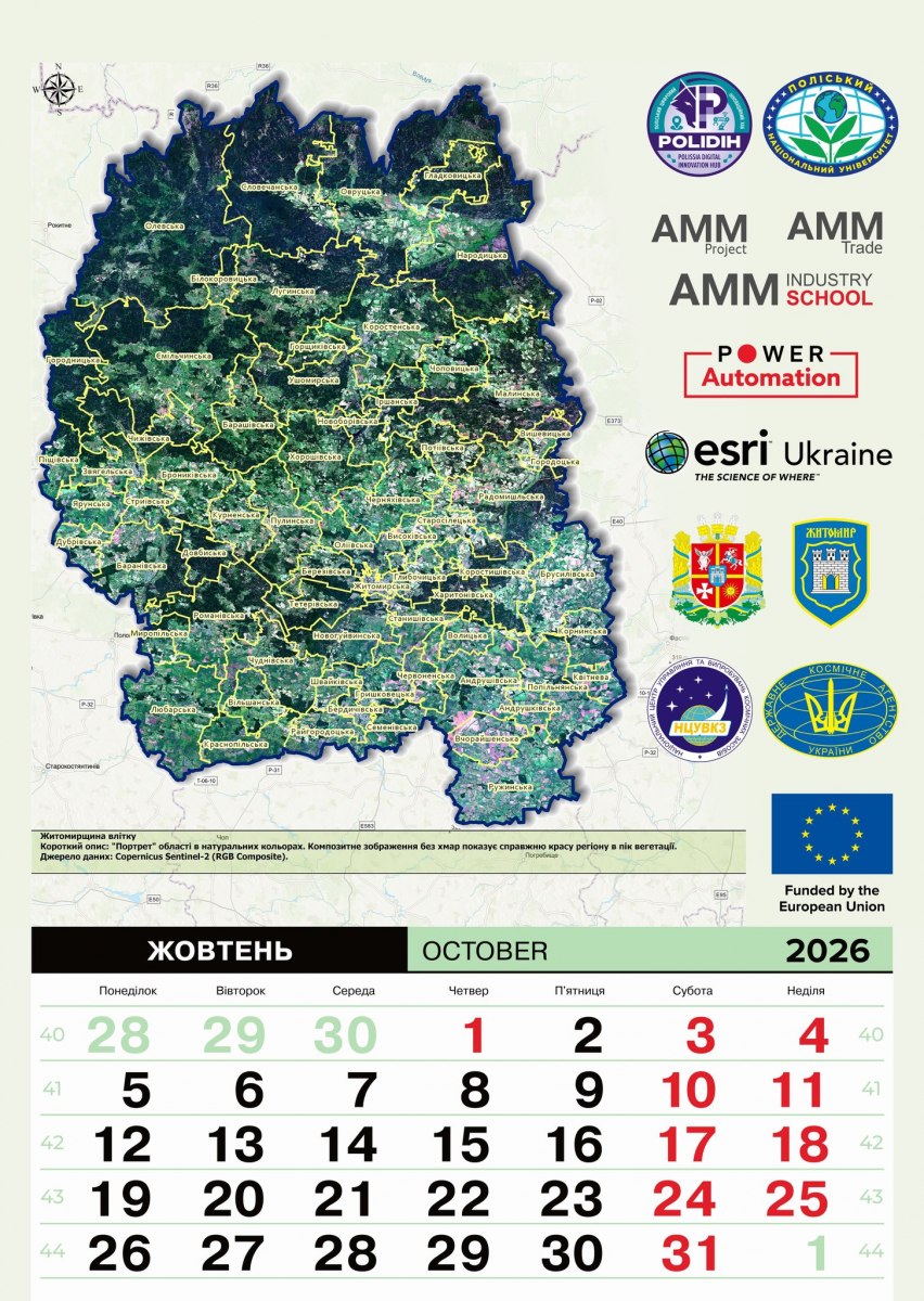 «Наш погляд на Житомирщину зазвичай обмежений горизонтом – з вікна авто чи під час прогулянок. Але який вигляд має наш край з висоти 786 кілометрів? Що можуть розповісти про нашу землю інфрачервоні сканери та радари європейських супутників «Sentinel»? Це не просто гарні зображення, а поєднання даних програми «Copernicus», штучного інтелекту Google, кліматичних моделей «ERA5» та професіоналізму команди «POLIDIH», – пояснює ректор Поліського національного університету Олег Скидан. – Кожна сторінка – аналітичний зріз, що демонструє «пульс» області: від запасів вологи та здоров’я лісів до якості повітря та нічного життя міст. Цей календар буде корисним аграріям, екологам, управлінцям громад, освітянам та всім, хто закоханий у наш регіон».