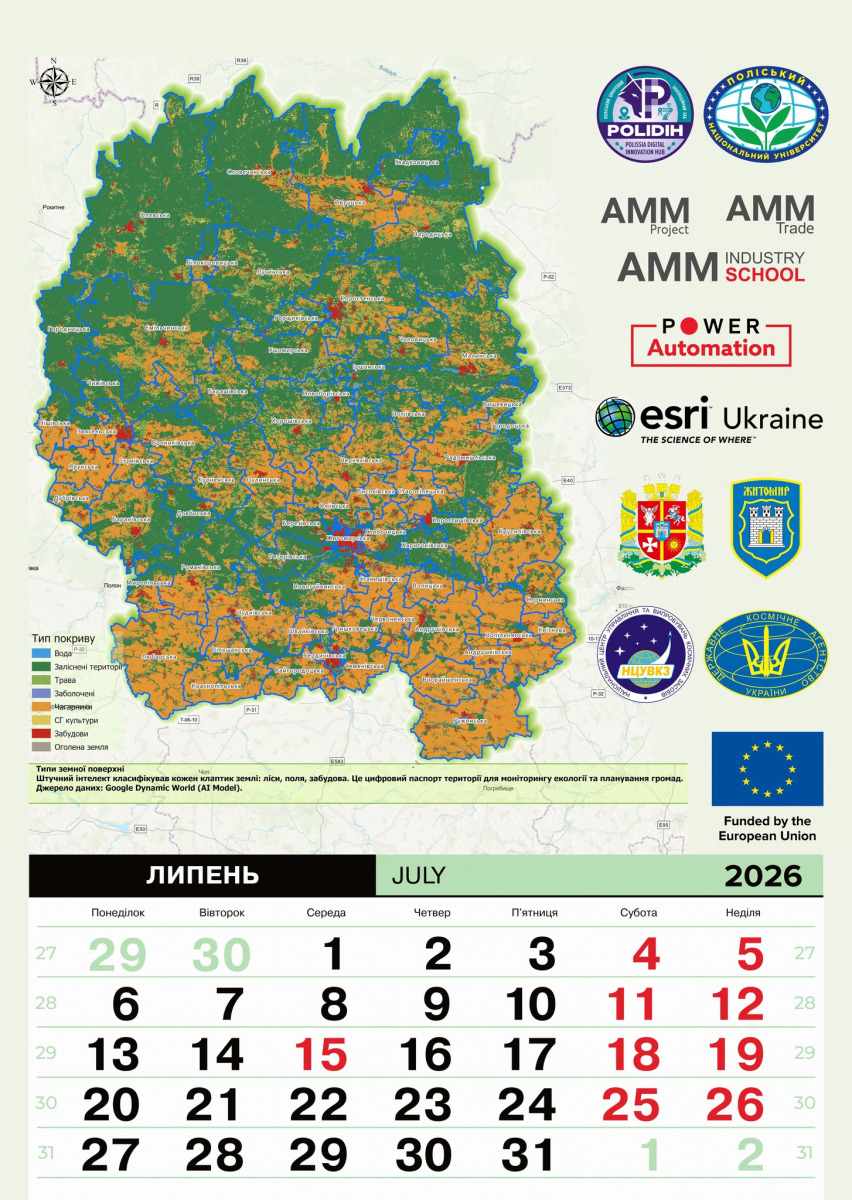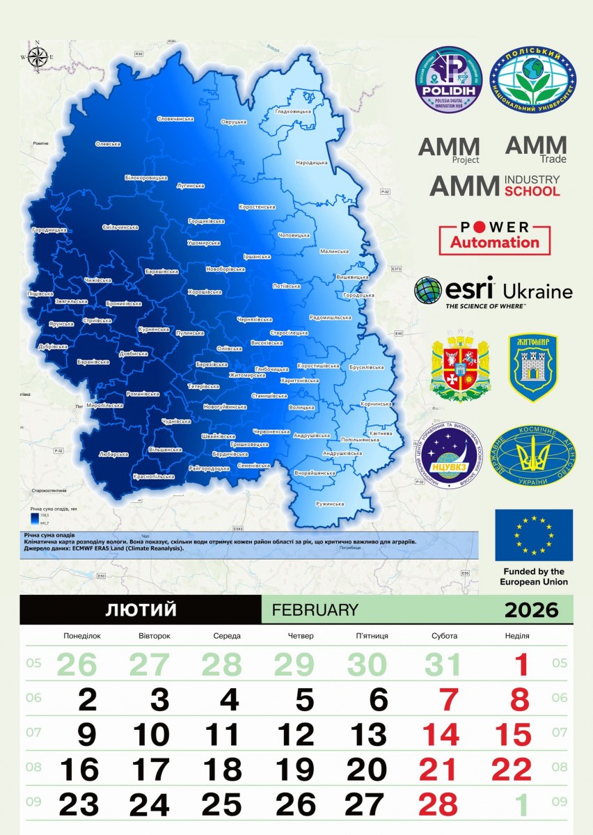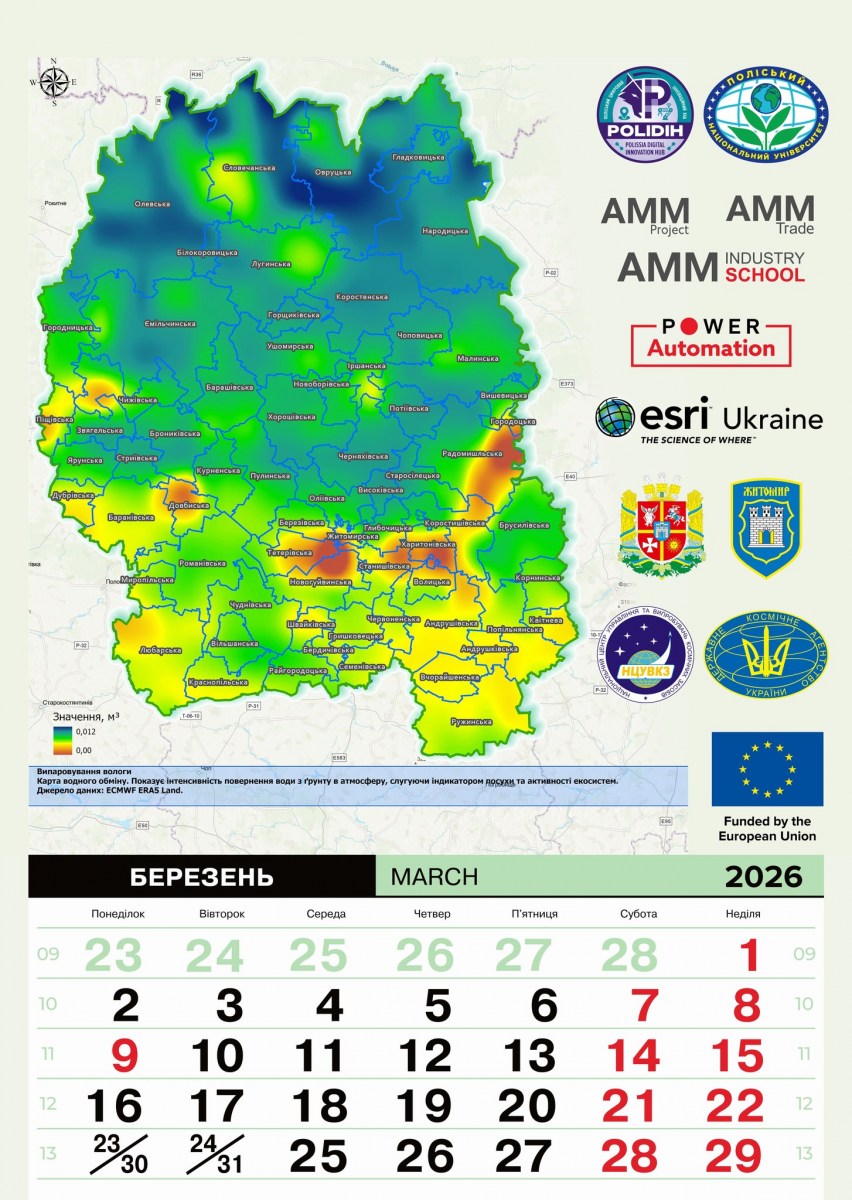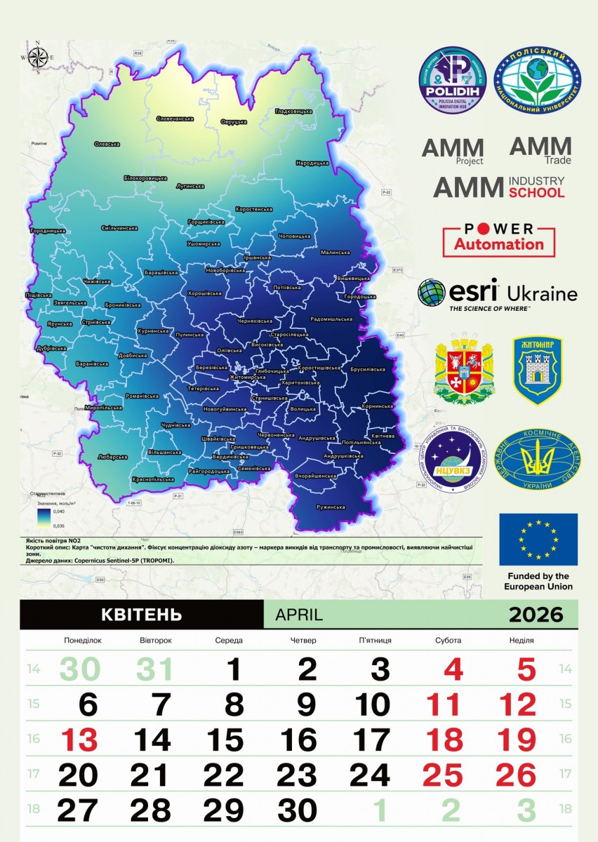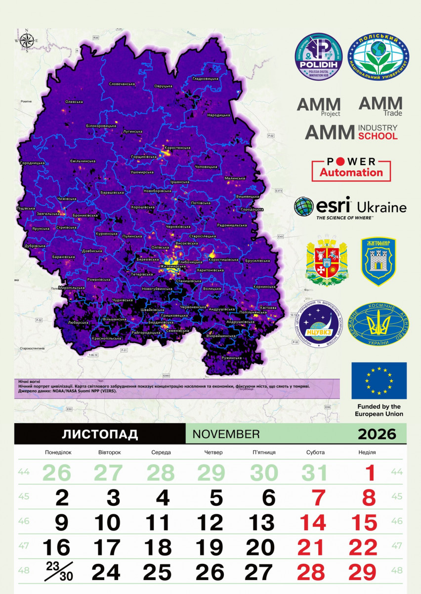 «Наш погляд на Житомирщину зазвичай обмежений горизонтом – з вікна авто чи під час прогулянок. Але який вигляд має наш край з висоти 786 кілометрів? Що можуть розповісти про нашу землю інфрачервоні сканери та радари європейських супутників «Sentinel»? Це не просто гарні зображення, а поєднання даних програми «Copernicus», штучного інтелекту Google, кліматичних моделей «ERA5» та професіоналізму команди «POLIDIH», – пояснює ректор Поліського національного університету Олег Скидан. – Кожна сторінка – аналітичний зріз, що демонструє «пульс» області: від запасів вологи та здоров’я лісів до якості повітря та нічного життя міст. Цей календар буде корисним аграріям, екологам, управлінцям громад, освітянам та всім, хто закоханий у наш регіон».