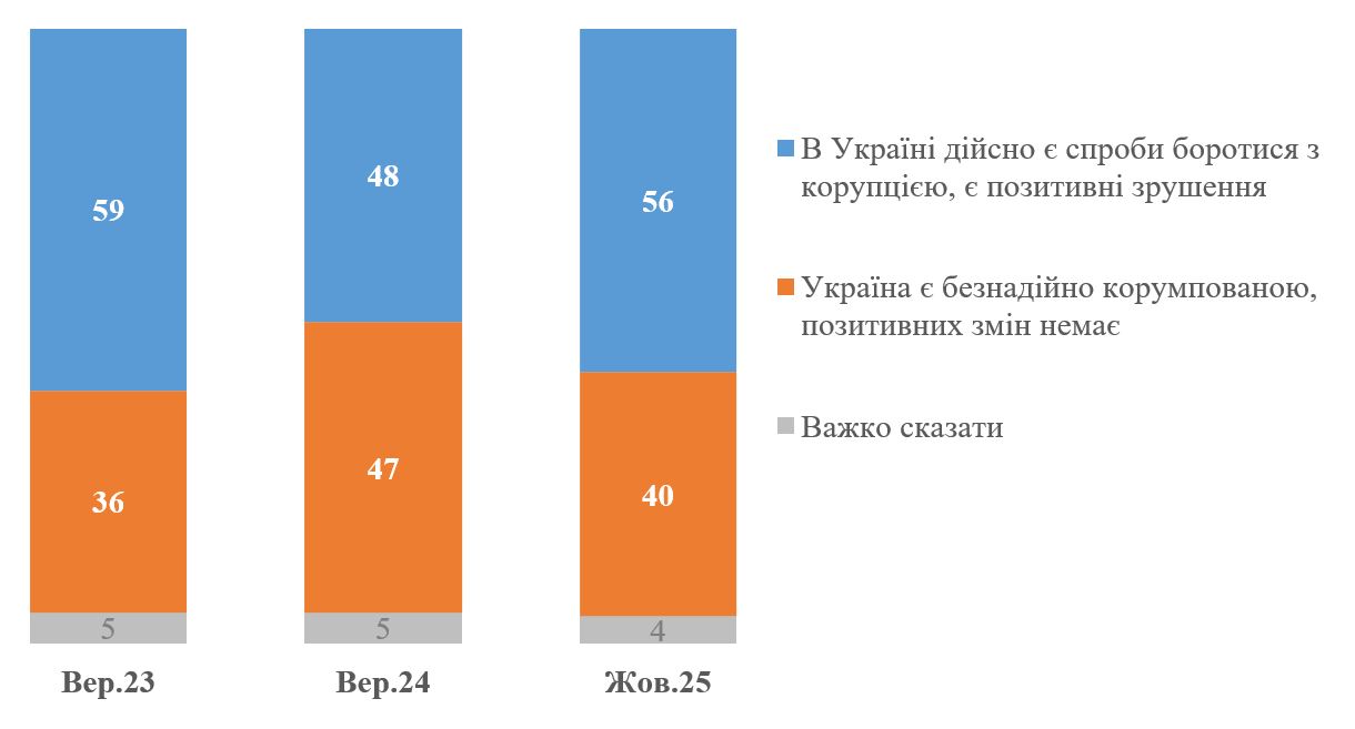 У 2025 році частка українців, які вважають Україну безнадійно корумпованою, становить 40%.