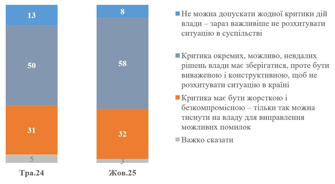 Водночас більшість респондентів (58% з цих 90%) вважають, що критика має бути «виваженою і конструктивною, щоб не розхитувати ситуацію в країні». На саме жорсткій і безкомпромісній критиці наполягає меншість – 32%. Порівняно з 2024 роком частка тих, хто наполягає на жорсткій критиці не змінилася, а частка тих, хто наполягає на конструктивній критиці – зросла.