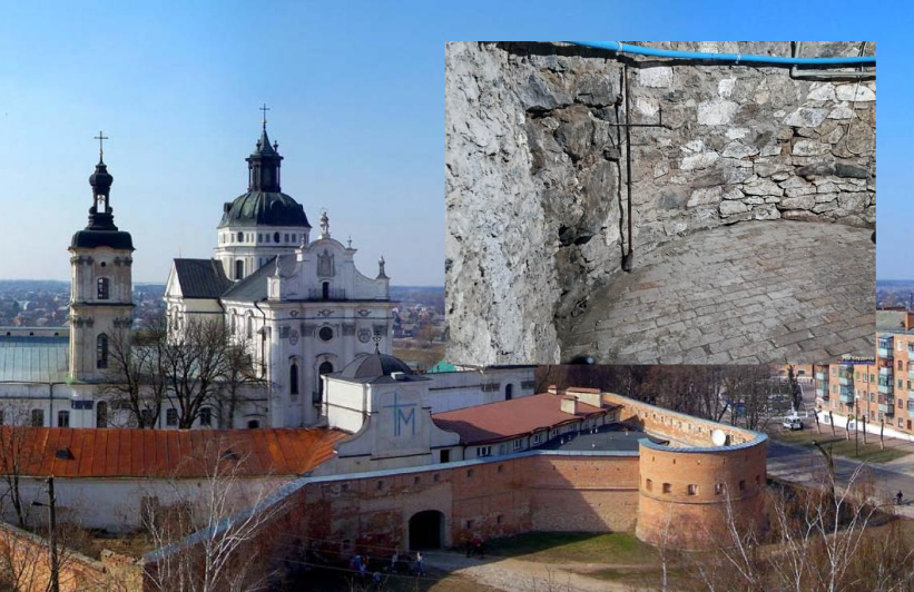 Анатолій Горобчук нещодавно вкотре побував у підземеллях кляштору, оглянув та доторкнувся руками до елементів Тишкевичевого замку. Фрагменти первісних стін збереглися. Зокрема, стіна сторожової башти стала основою прибрамного комплексу – це чудово видно з форми мурів, типу кам’яної кладки та використаного матеріалу. На фото, розміщеному поряд, видно цю стіну та більш пізню по часу підлогу, викладену обпаленою цеглою.