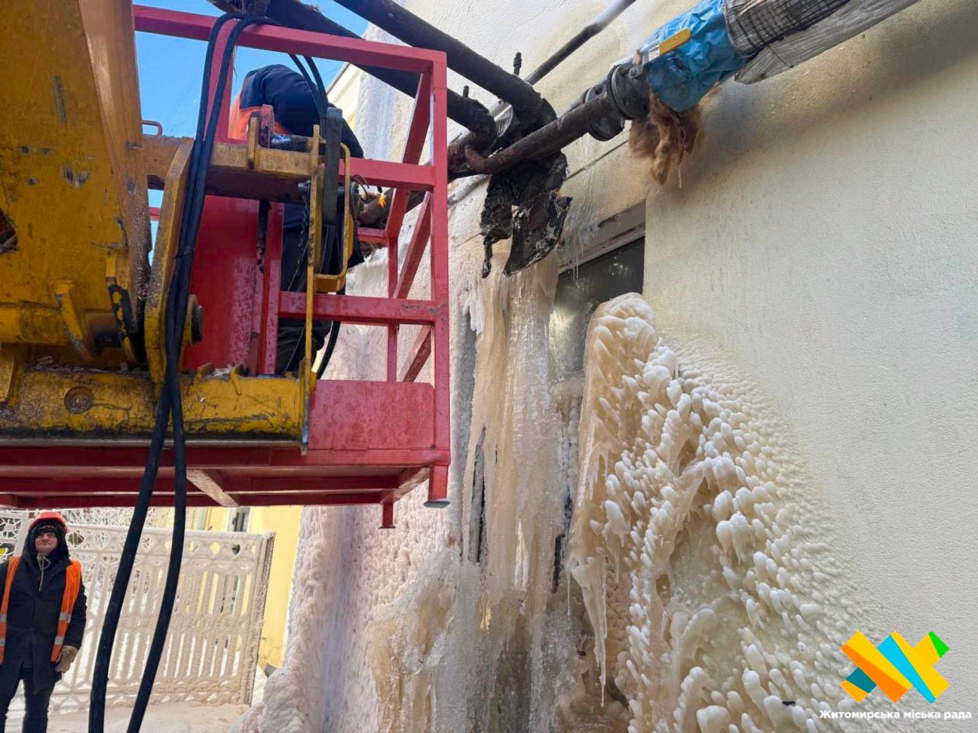 «В аварійному режимі замінюємо ділянку труби. Для цього довелося злити воду з будинку. При такій температурі вода замерзає буквально на ходу — на фасаді утворилися обмерзлі брили льоду», — розповідає майстер дільниці №4 КП «Житомиртеплокомуненерго» Андрій Гуторович.
