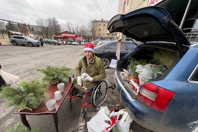 Ветеран російсько-української війни Андрій Хом’як, який після тяжкого поранення під Києвом у 2022 році втратив обидві ноги, удвох із дружиною у Житомирі створюють різдвяно-новорічні композиції. Букети жителям та гостям міста пара дарує — святковий збір на донати оголосили у соцмережі.