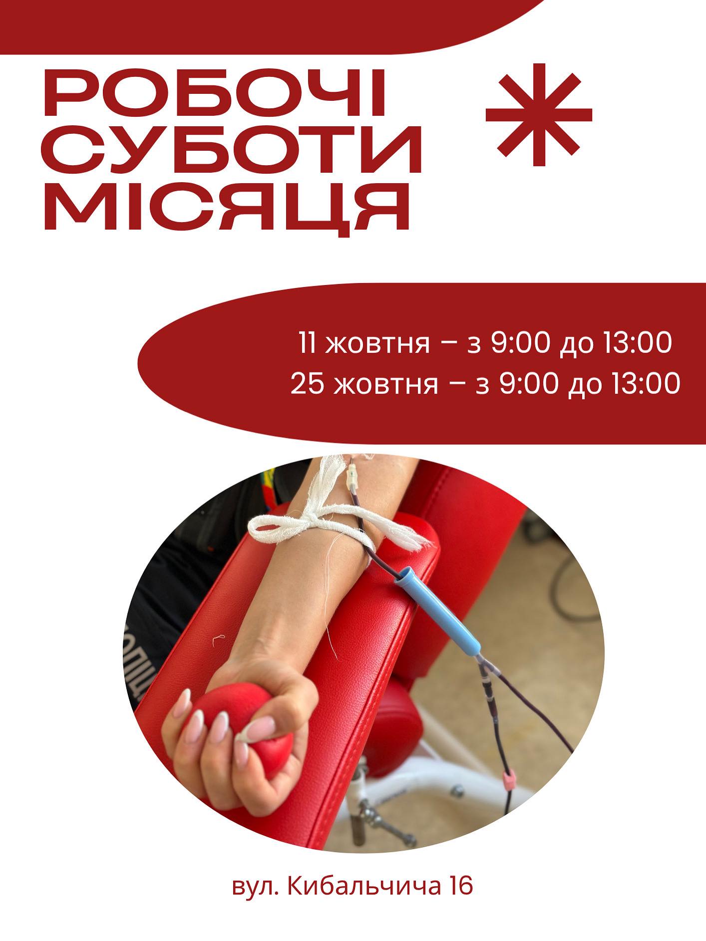 Долучитися зможуть усі охочі. Донорів прийматимуть щодня, включно з суботами: 11 та 25 жовтня.