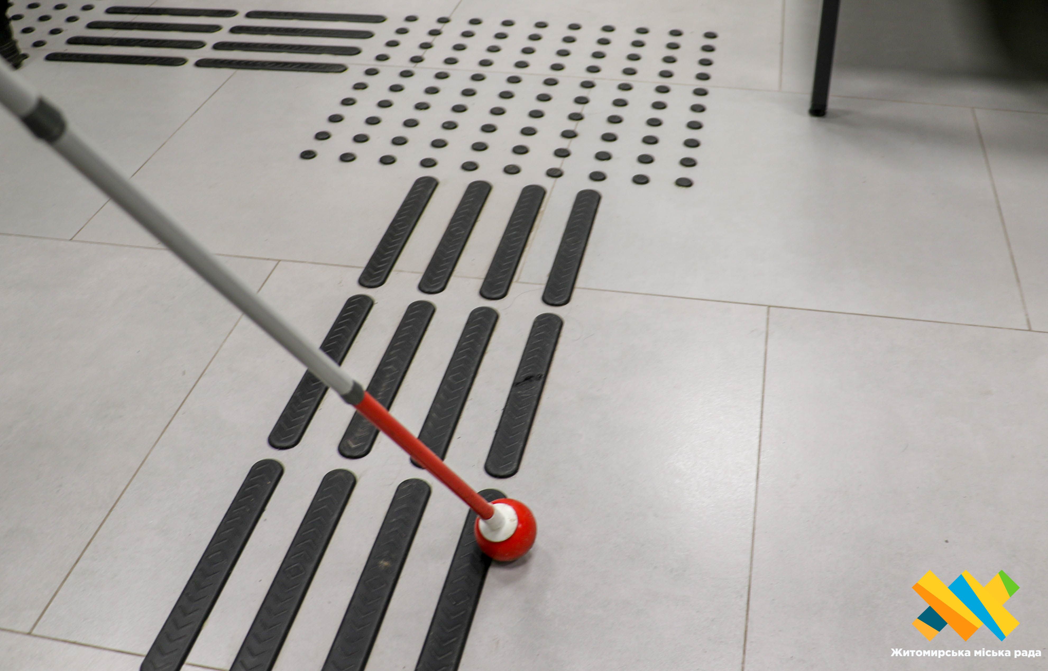 Бачимо, як Олена Тимохіна, яка має порушення зору, рухається залом, орієнтуючись на навігацію, що на підлозі. Точкові тактильні позначки підказують, що попереду зміна напрямку, перешкода або важливий об’єкт.