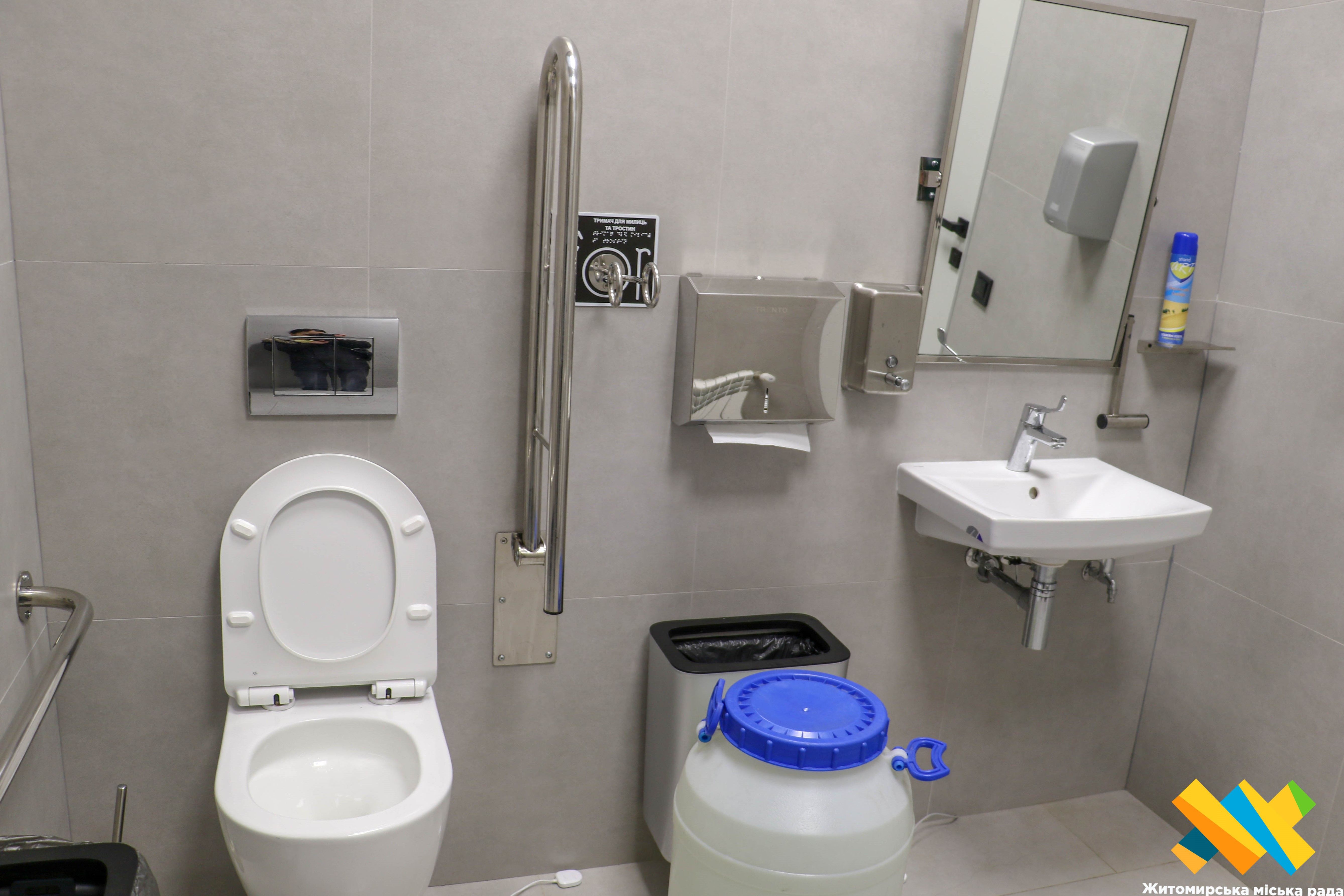 У вбиральні також все інклюзивно: висота всіх елементів відповідає потребам людей з інвалідністю, передбачені спеціальні поручні, а також кнопка з мотузочком на випадок, якщо раптом знадобиться допомога в непередбачених ситуаціях.