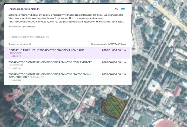 Іншими учасниками були ТОВ "БУД. ЕМПАЄР" (запропонував на 1 тисячу гривень менше, ніж переможець) та ТОВ "ФУТБОЛЬНИЙ КЛУБ "ПОЛІССЯ" (найвища ставка була 105 млн грн).