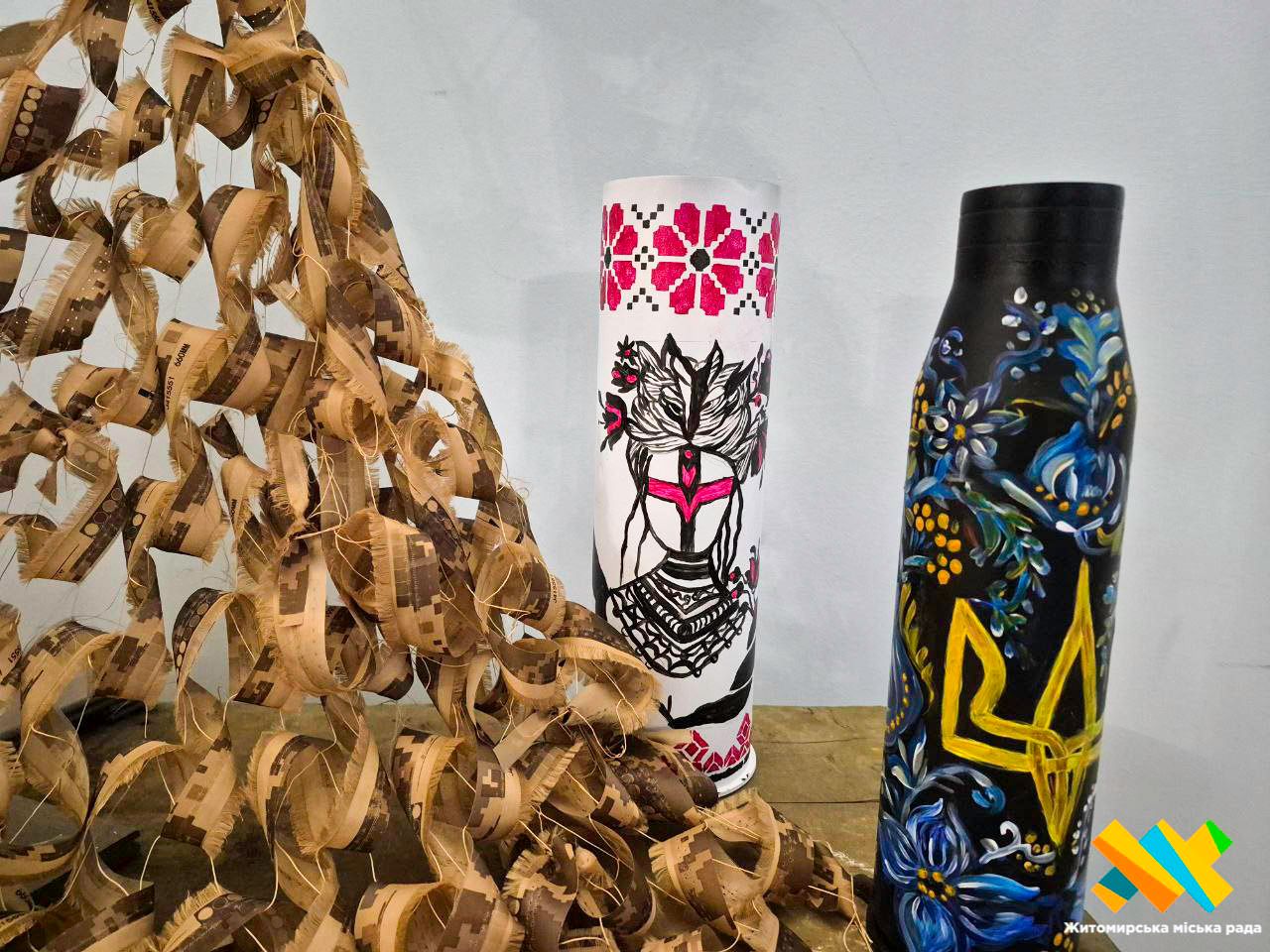 Калина, обереги, мотанки та зелені листочки... Кожен із них символізує окремий рід військ Збройних Сил України. До композиції додали розмальовані гільзи та шеврони.