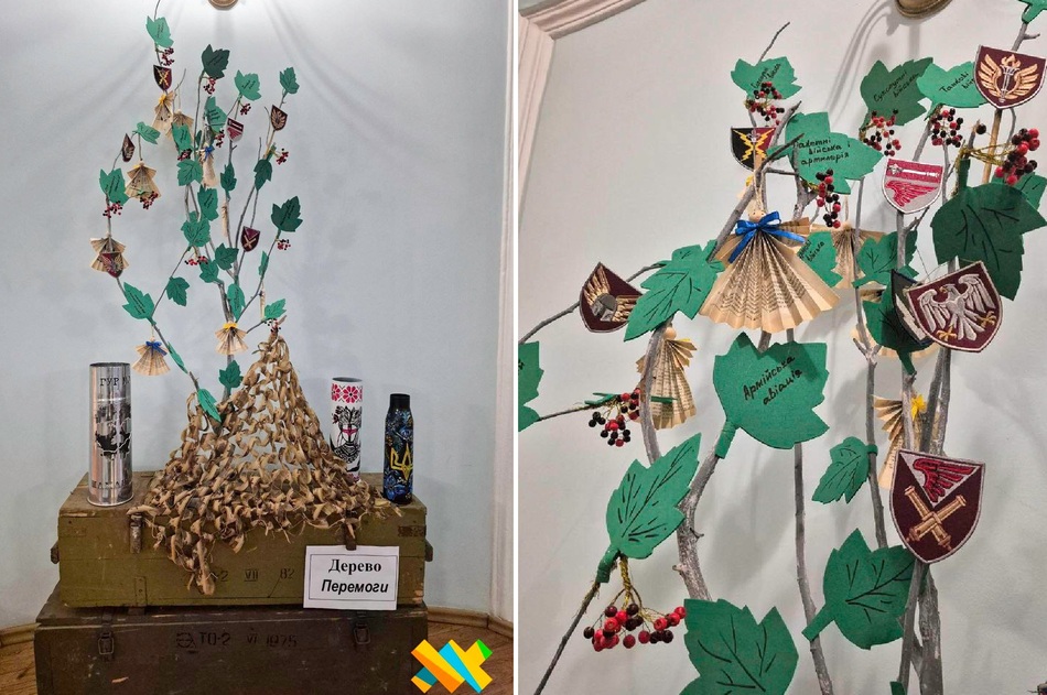 Основа дерева — ящик з-під зброї, що зберігався з 2022 року. Завершальний акцент — елементи маскувальної сітки, які передали волонтери.