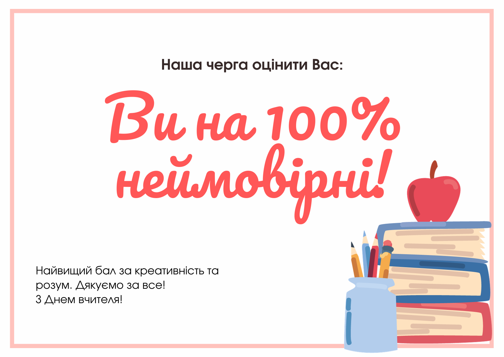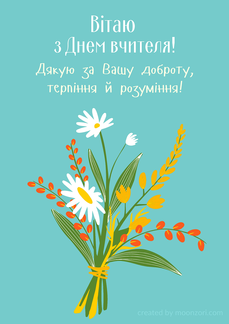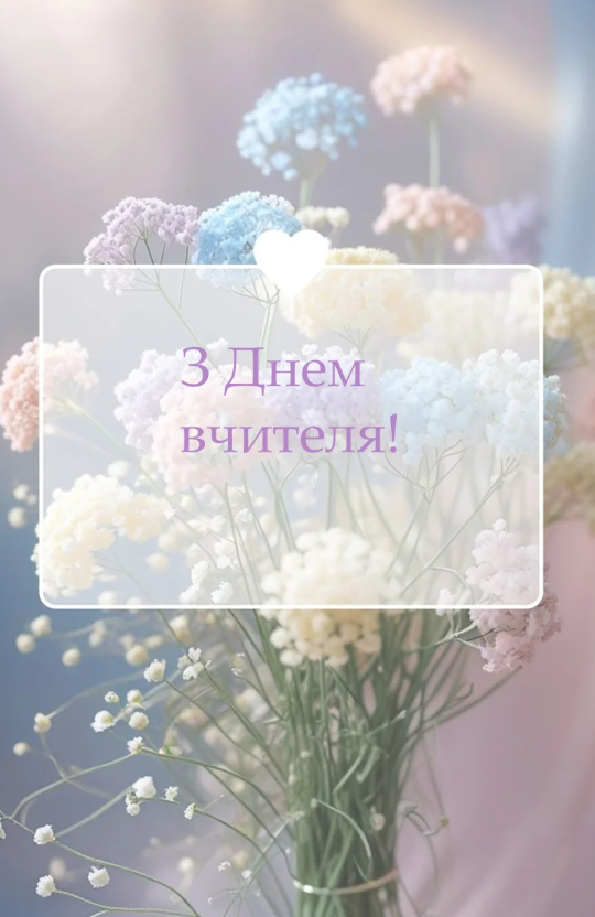 Щиро вітаємо вас з Днем вчителя! Дуже дякуємо за вашу працю та бажаємо мати все для щасливого життя, поринати у любов, радощі та теплі обійми кожного дня, насолоджуватися своєю діяльністю, бачити яскраві очі вдячних учнів та молодіти разом із ними!