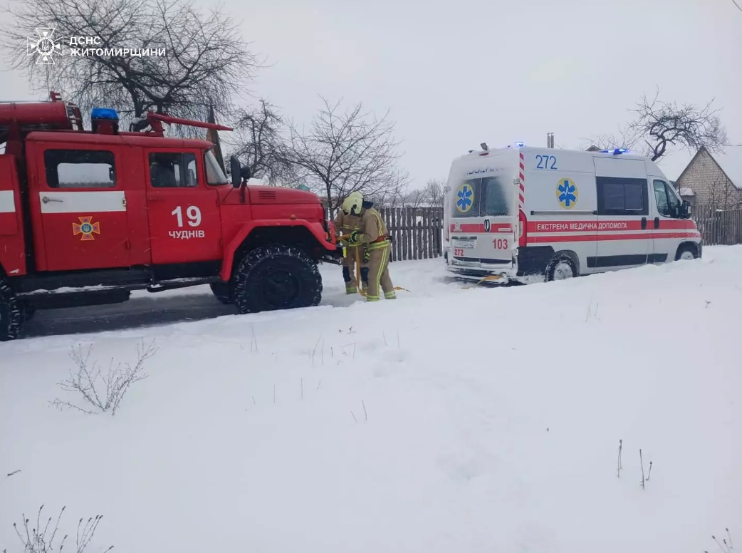 «У Житомирі та Бердичеві через негоду було визволено три вантажні автомобілі. Вночі в селі Браженка Житомирського району у сніговий замет потрапив легковик із породіллею — надзвичайники оперативно відбуксирували авто на розчищену дорогу, що дозволило продовжити рух. Також у Бердичівському районі рятувальники доставили водія, який потребував допомоги до пункту обігріву. Загалом за добу здійснено 17 виїздів, під час яких було транспортовано 18 одиниць автотехніки, з них — 10 "швидких"», — йдеться у повідомленні.