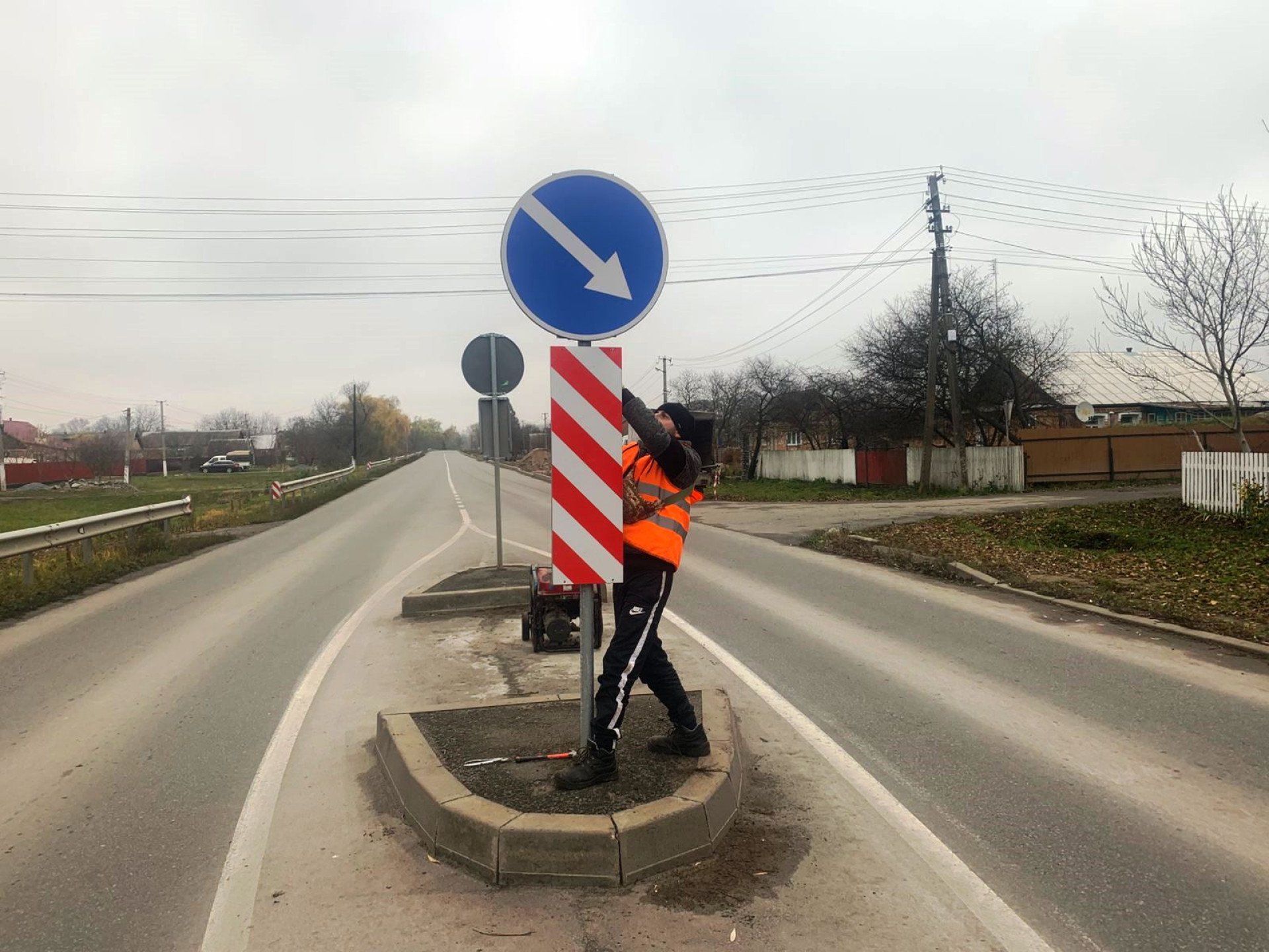 Відновлюють необхідні комплекти дорожніх знаків на семи «острівцях безпеки» перед населеними пунктами Красносілка, Юрівка та Іванківці на дорозі Н-03 Житомир – Чернівці.