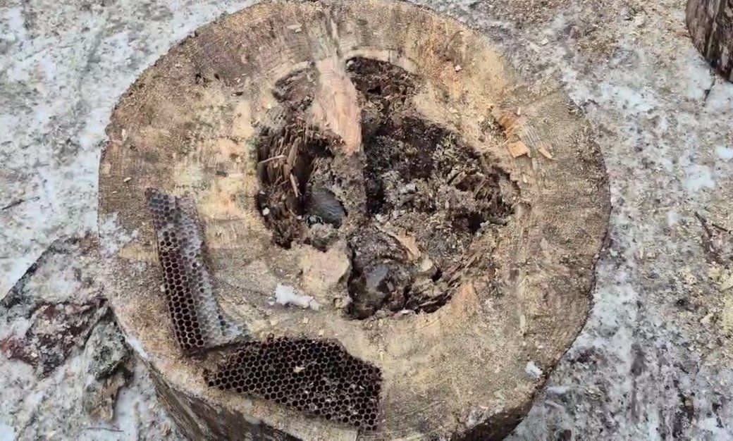 У дуплі старої сосни, яку привезли разом із дровами для котельні Олевського ліцею №1 на Житомирщині, виявили покинуте гніздо диких бджіл з понад трьома кілограмами меду. Скарб виявив директор закладу Євгеній Рябой.