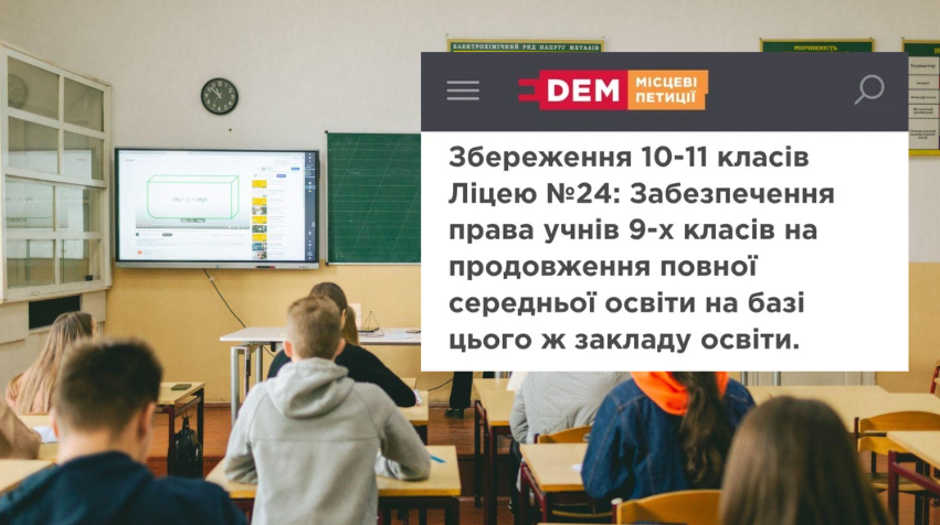 Петицію «Збереження 10–11 класів Ліцею №24: забезпечення права учнів 9-х класів на продовження повної середньої освіти» зареєстровано 21 жовтня на платформі електронної демократії. Наразі її підтримало 134 голоси з 300 необхідних. До закінчення збору голосів лишилось ще майже два тижні.