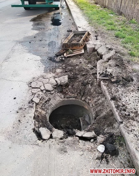 «Наш автомобіль зранку їхав по Житомиру, на Київському шосе, 63 був неналежно закріплений люк: він вилітає і пробиває бак з пальним. Півтонни «солярки» витекло на проїжджу частину. Патрульні не вірно склали протокол, у ньому вони зазначають, що наш водій винен у ДТП. Зараз тут вже працюють дорожники: асфальтують і встановлюють люк», - обурюється співробітник «Укрпошти».