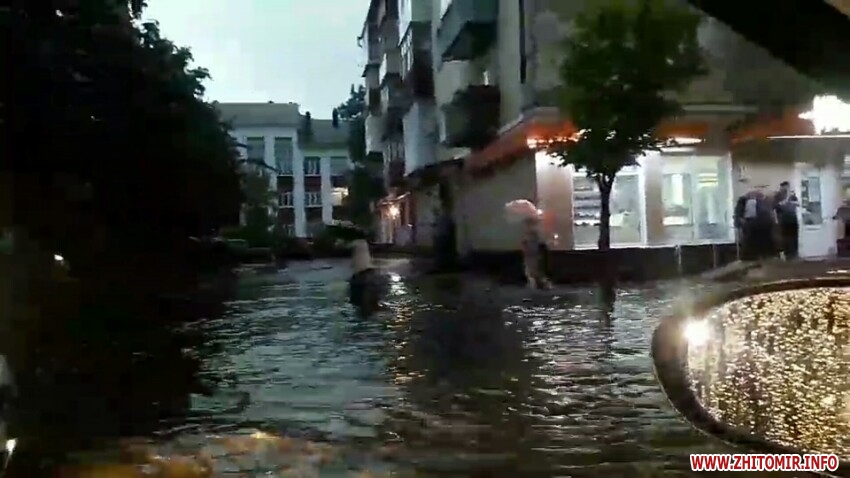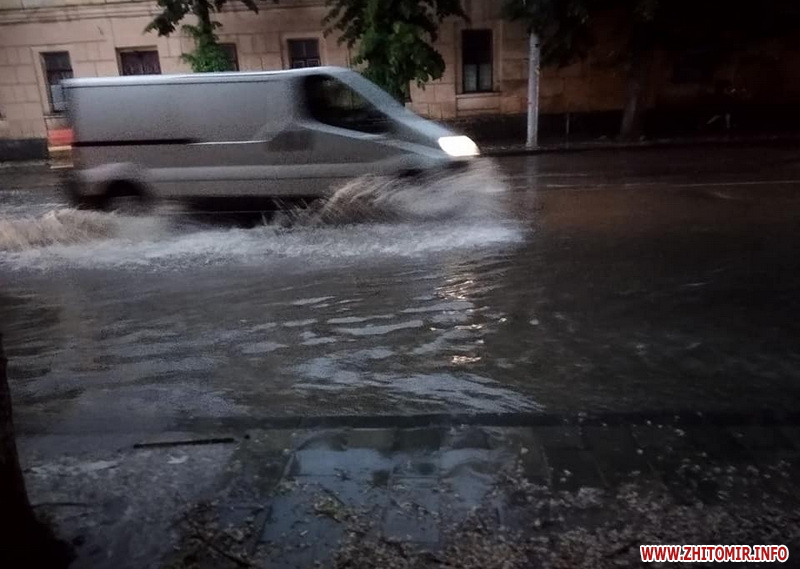 Також злива частково затопила деякі вулиці у центрі Житомира: Грушевського-Покровська, Новий бульвар, Хлібна, Велика Бердичівська, Ріхтера.