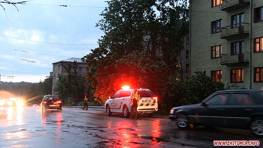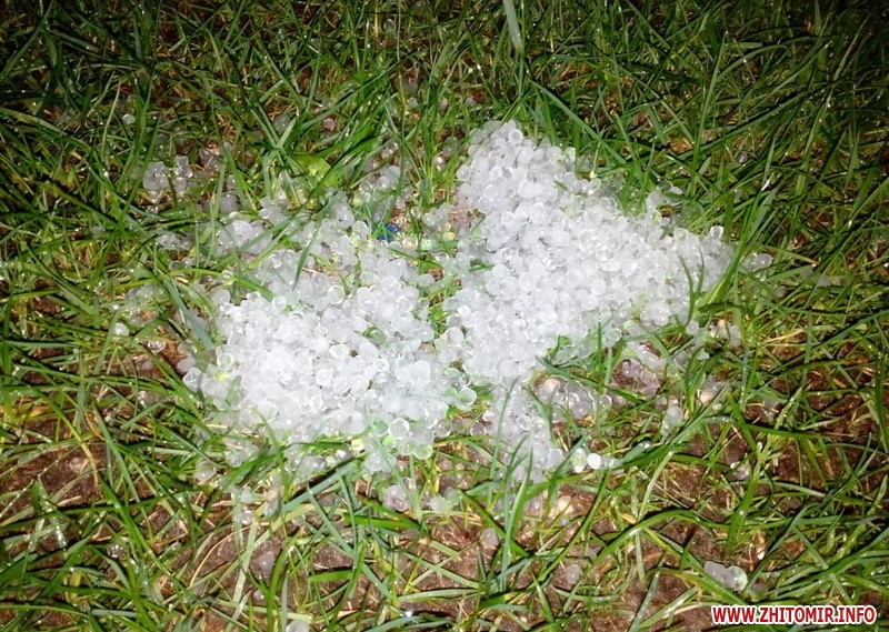 За інформацією Житомир інфо, в районі вулиці Вільський Шлях випав град розміром з вишню. На вулиці Леха Качинського вітер викорчував дерево і звалив на дроти. Рух регулювали патрульні.