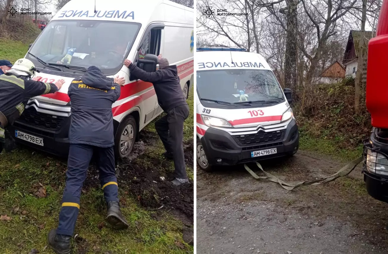 «22 грудня о 12:37 до Служби порятунку "101» надійшло повідомлення про те, що потрібна допомога рятувальників у відбуксируванні автомобіля швидкої допомоги. Пригода трапилася у м. Звягель. Швидка їхала з хворою дитиною до лікувального закладу та застрягла у бездоріжжі», — йдеться у повідомленні.
