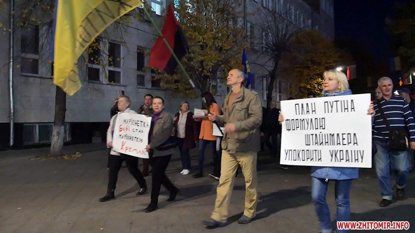 Як повідомляє Житомир інфо, активісти розпочали акцію з гімну України та більше пів години простояли на майдані Корольова з плакатами: «Президент не слуга Кремля», «План Путіна формулою Штайнмаєра упокорити Україну», «Формула Штайнмаєра = Формула Путіна».