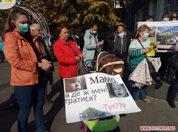 Як пише Житомир інфо, люди прийшли з тематичними фотоплакатами, деякі одягнуті в медичні маски та протигази.