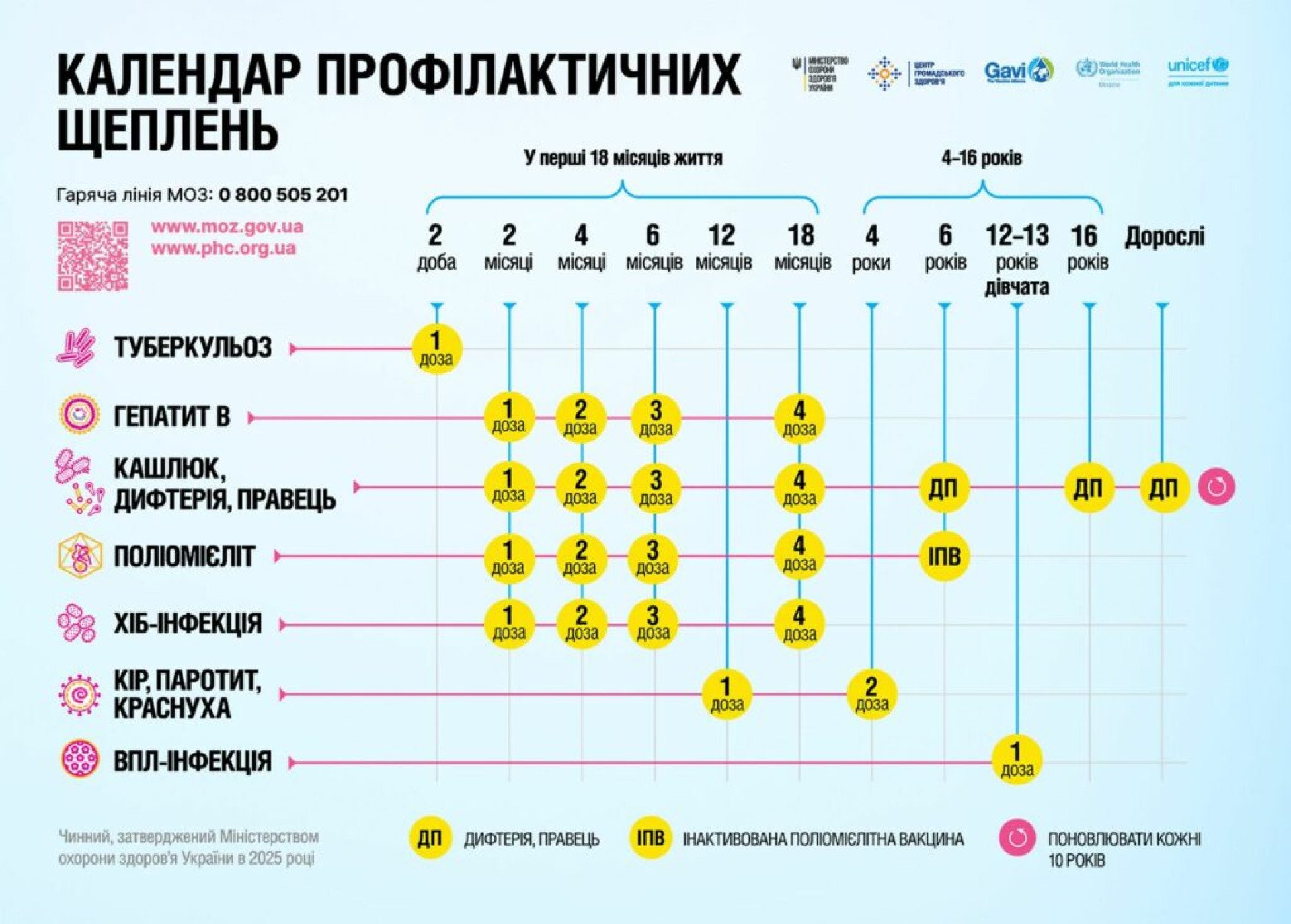 Щеплення проти ВПЛ, зміна вакцинації за віком та комбіновані вакцини: вже за місяць Календар профілактичних щеплень в Україні — зміниться. Оновлений Календар профілактичних щеплень з 1 січня 2026 року охоплюватиме обов’язкову вакцинацію проти 11 інфекційних захворювань: туберкульоз, гепатит В, кір, паротит, краснуха, поліомієліт, дифтерія, правець, кашлюк, ХІБ-інфекція та вірус папіломи людини (ВПЛ).