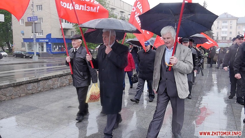 На майдані Соборному у Житомирі учасники акції розгорнули червоні стяги із написами «Наша мета соціалізм» і рушили колоною до офісу Компартії, передає Житомир інфо.