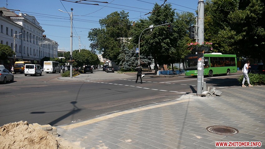 «Тут у нас перехрестя нерівнозначне. Стосовно напрямку руху проєктанти заклали пониження у тому місці, де зараз воно є. Чому така розмітка? Я думаю, що в управлінні транспорту ми це питання перепогодимо і розмітка після облаштування асфальтобетонного покриття буде вже зроблена правильна. Я думаю, що до кінця літа наші тротуари в чистому вигляді будуть уже готові і виправлені будуть усі недоліки», - зауважив начальник управління капітального будівництва Житомирської міської ради В’ячеслав Глазунов.