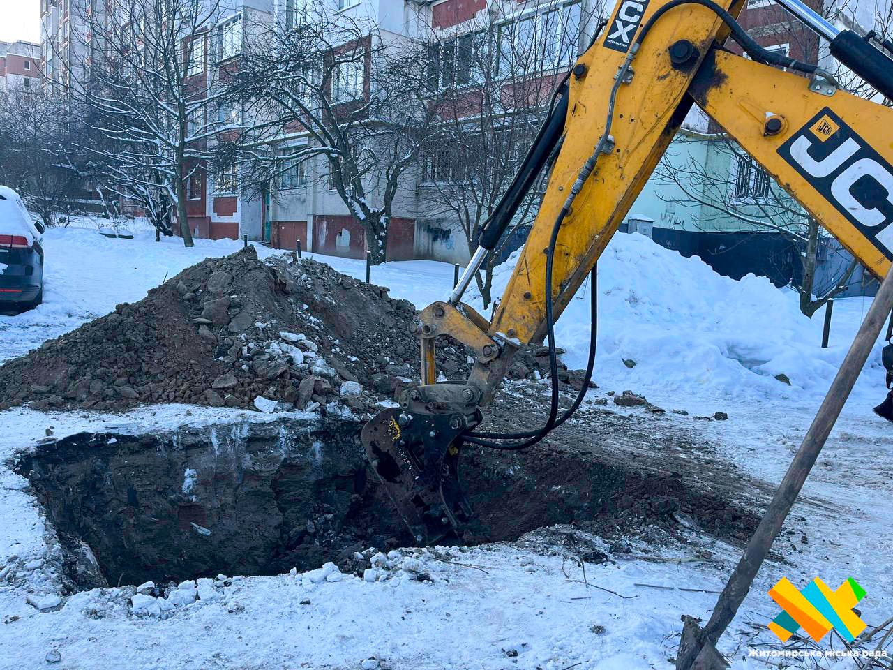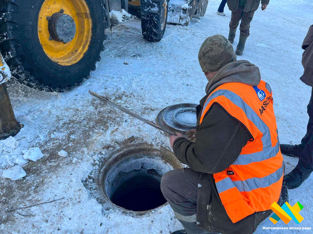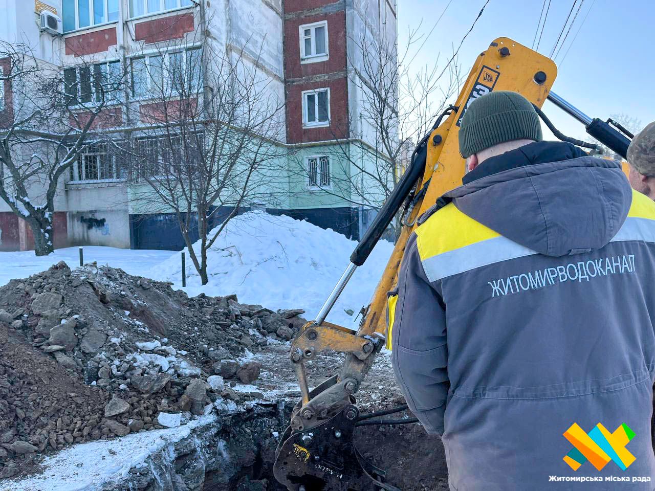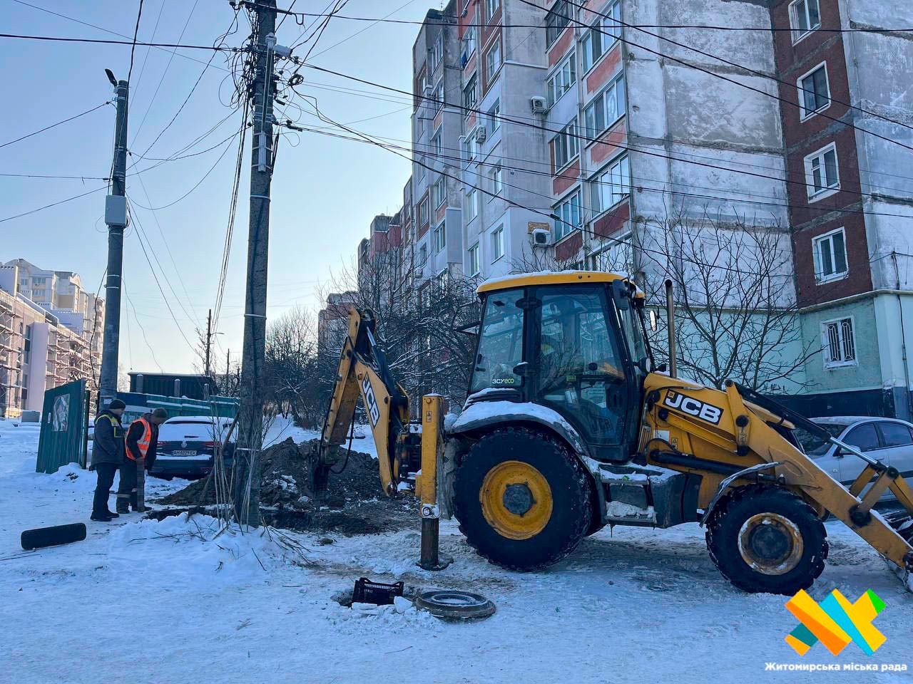 «Було виявлено витік води в оглядовому колодязі зв’язку, який розташований поруч із проходженням водопровідних мереж. Наразі проводяться аварійні роботи. Їх ускладнюють значні морози, адже глибина промерзання ґрунту сягає 53 сантиметрів і більше, що ускладнює визначення точного місця пориву. У цей момент бригади виконують роботи з розриття котловану», — зазначив начальник управління з ремонту та експлуатації водопровідних і каналізаційних мереж КП «Житомирводоканал» Олександр Мошенецький.