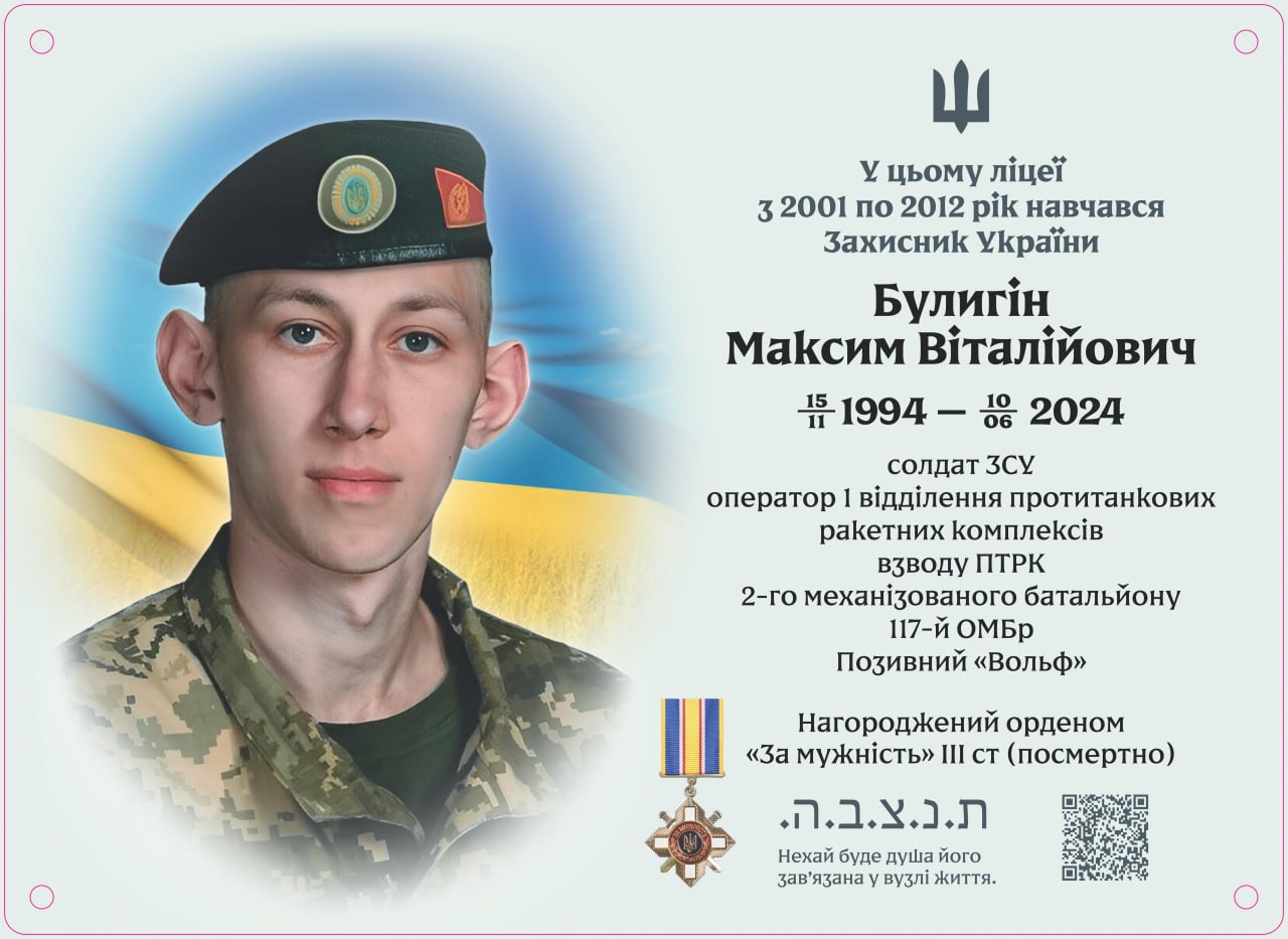 На фасаді будівлі приватного ліцею «Ор Авнер» у Житомирі встановлять меморіальну дошку Захиснику України Максиму Булигіну.