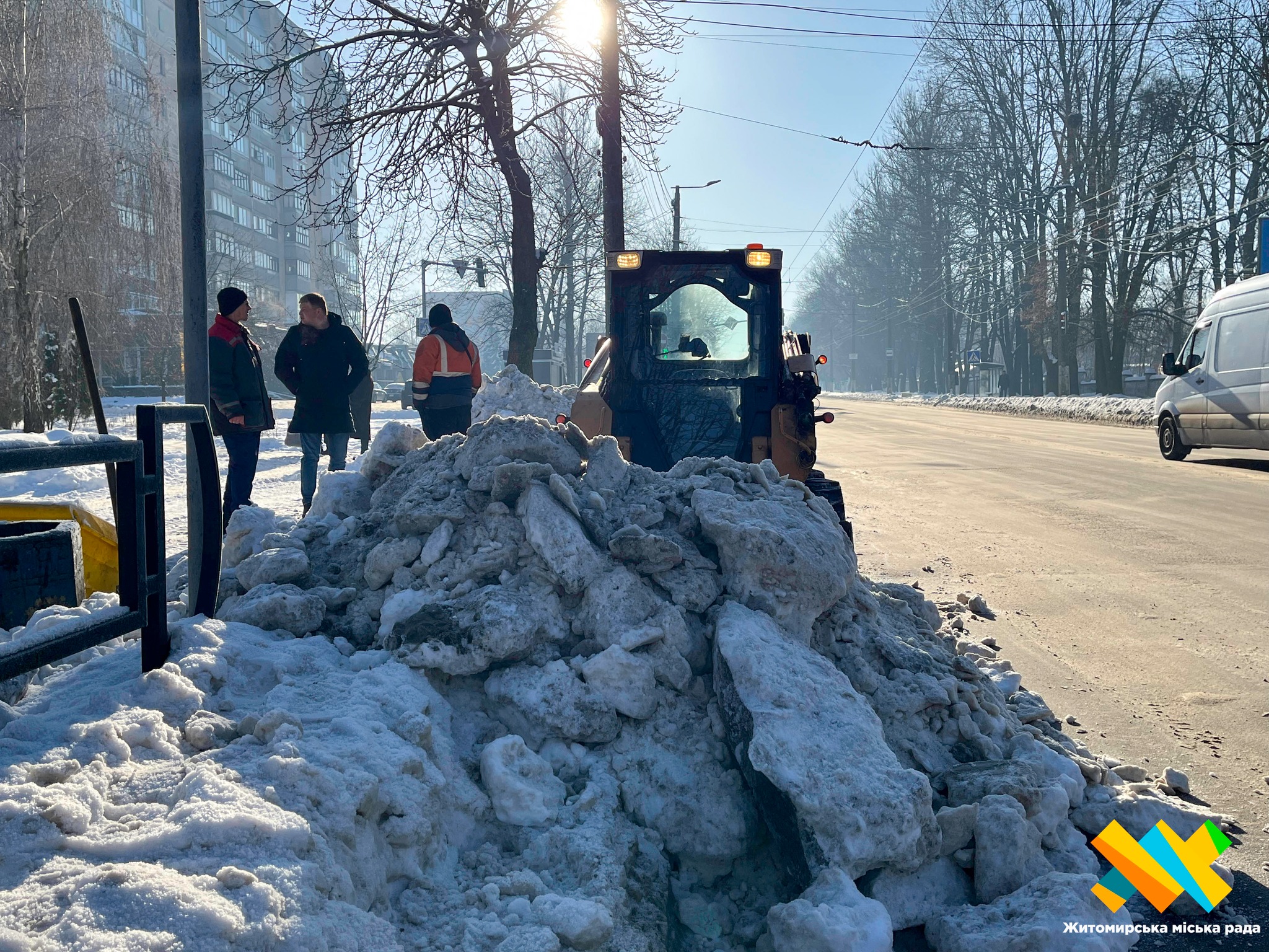 Зупинки громадського транспорту та пішохідні переходи — пріоритетні зони. Уночі повністю прочистили зупинки на вулиці Великій Бердичівській, окремий міні-навантажувач завершив очищення Чуднівської.